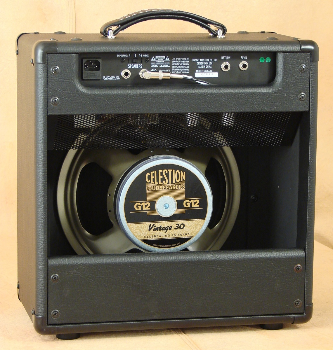 Корпус из 16 мм березовой фанеры с открытой задней стенкой покрыт износостойкой черной синтетической кожей, углы защищены колпаками, устойчивость на гладких поверхностях обеспечивают четыре резиновые ножки. Металлическая панель с элементами управления расположена в углублении на передней стенке. Стильные ручки, напоминающие куриные головы, легко доступны. 12-дюймовый динамик Celestion Vintage 30 обеспечивает достаточную мощность, надежно закреплен и защищенной прочной тканевой решеткой. Завершает продуманный дизайн тщательно прошитая кожаная ручка в верхней части корпуса. COUGAR 5 удобен для домашних репетиций, для работы в небольших клубах